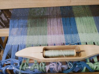 Tissage en action d’une écharpe dans les tons bleu-violet-vert